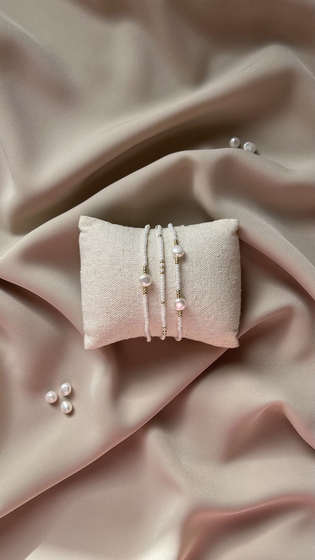 L'assortiment AGNÈS est une composition lumineuse de trois bracelets en perles de rocaille. Deux d'entre eux sont sublimés par des perles d'eau douce naturelles, qui ajoutent une touche d'élégance ! Leur teinte blanc nacré et doré se marient harmonieusement pour une allure minimaliste et raffinée.